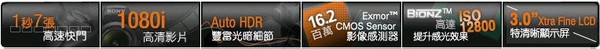 | 其他功能 | 創意風格:標準、鮮艷、人像、風景、日落、黑白 (對比度 / 飽和度 / 清晰度可以+/-3級調校) D-Range Optimizer 優化技術:關閉 / 自動 / 1至5級 自動HDR (自動曝光差,可調校自動曝光差:於1-6 EV以1EV級調校) |